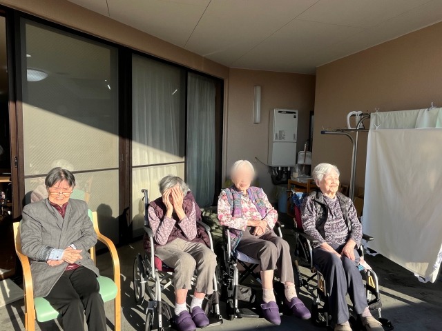 気持ちの良い日は外気浴 2025年11月28日/カテゴリ: グループホーム /作成者: isyr47jx11月とは思えないほど 天気の良い日が続いています。 風もなく本当に暑いぐらい。 気持ちの良い天気です。 こんなにきれいな青空!!! 外の運動は気持ちが良いです。 M様のこんな笑顔も久しぶり 素敵な写真です。 目が開かない!!! 日差しがまぶしい!!!N様も困っている様子。 ベランダでもN様は目が開かない様子。 サングラスが必要かな。 https://mnz.co.jp/wp/wp-content/uploads/2025/11/IMG_1018.jpg 640 480 isyr47jx https://mnz.co.jp/wp/wp-content/uploads/2017/10/mnz_logo.png isyr47jx2025-11-28 16:52:302025-11-28 16:52:30気持ちの良い日は外気浴